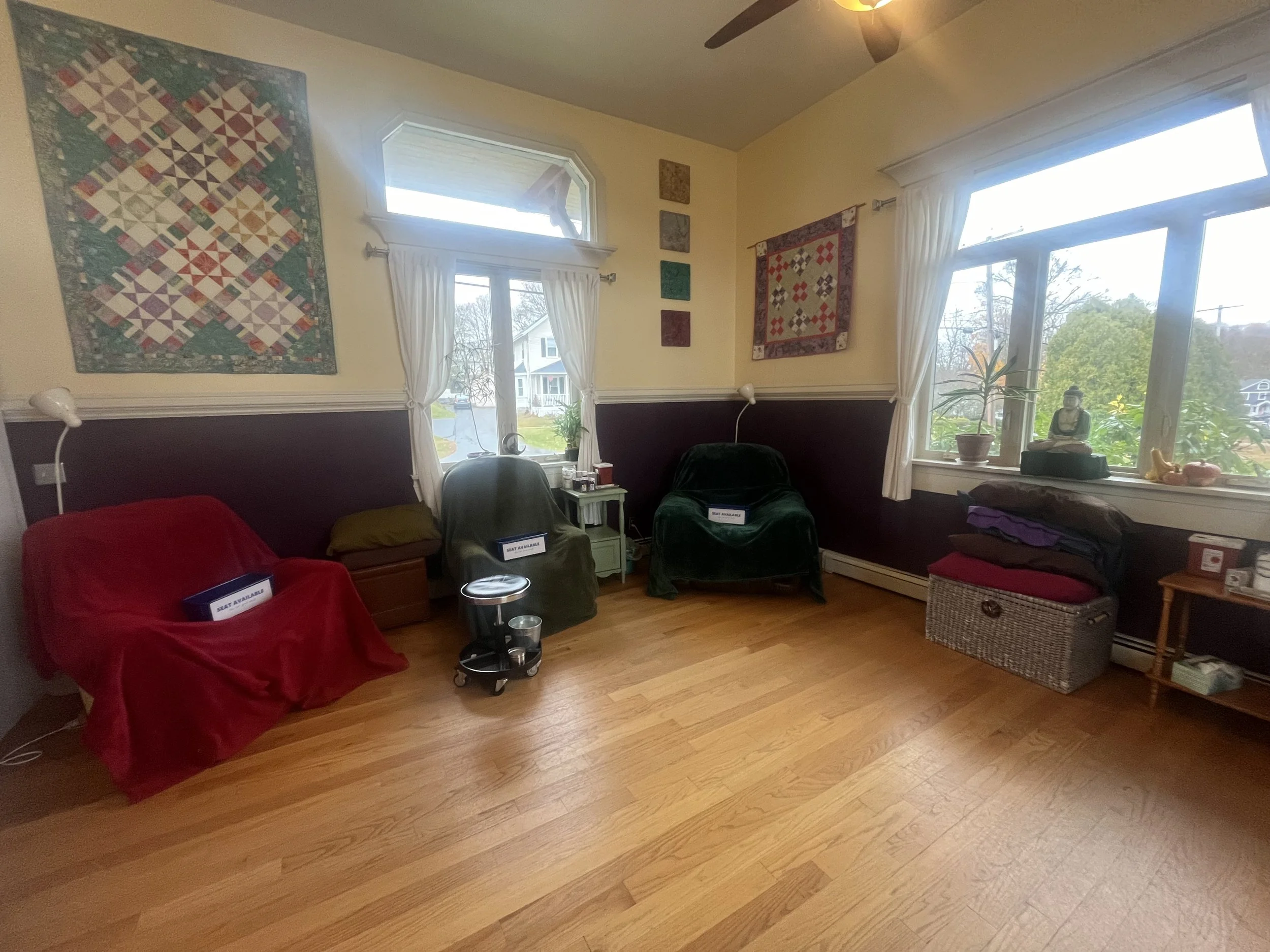 Acupuncture: all acupuncture points including back and torso points are available for treatment in a private room. May utilize other modalities of Chinese medicine including cupping, moxa, heat lamp, guia sha, e-stim